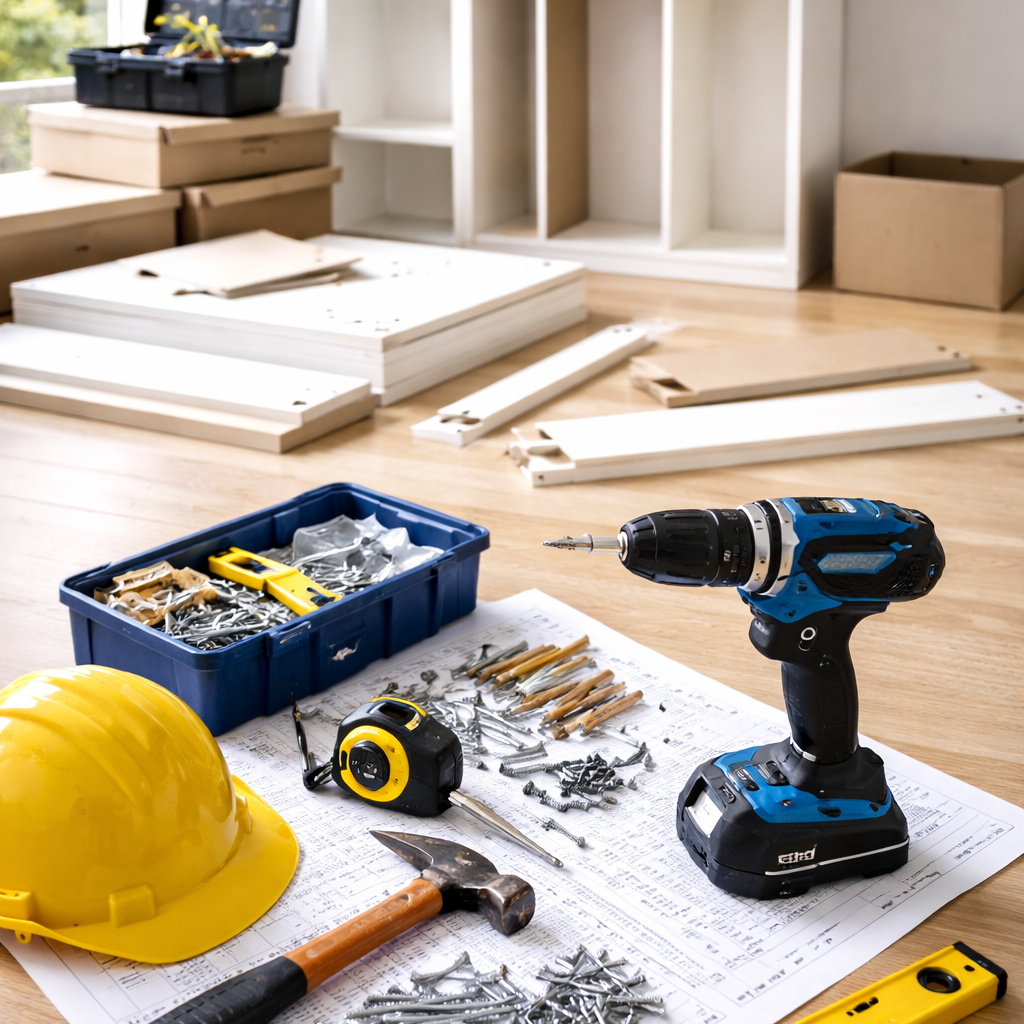 Montage et fixation de meubles avec précision en respectant les notices et en prenant soin du lieu de montage sols et murs.