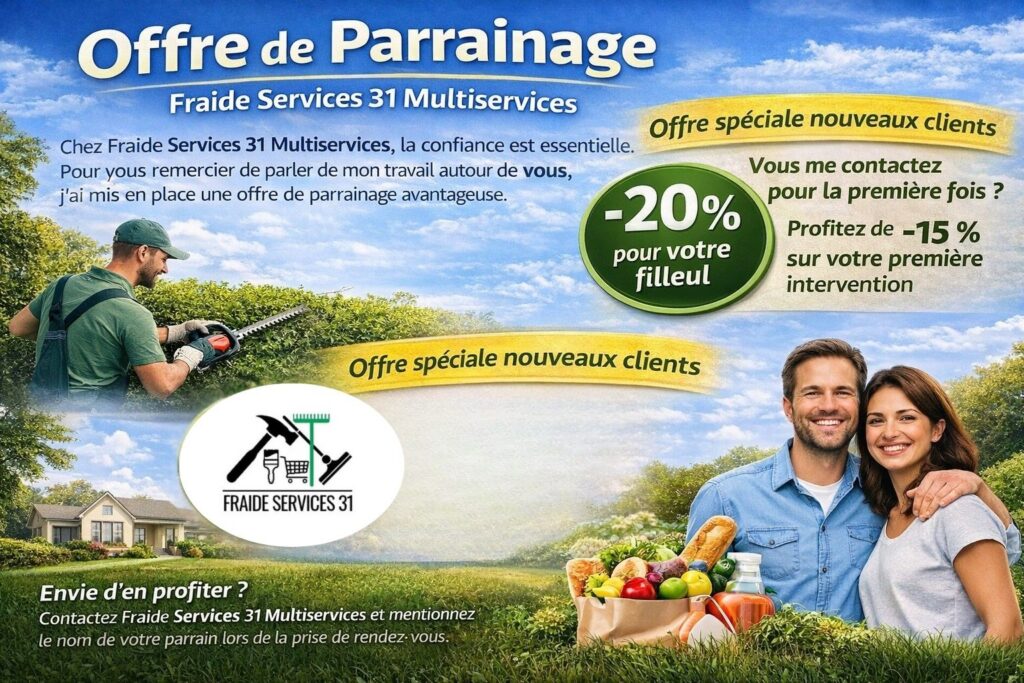 Chez Fraide Services 31 Multiservices, la confiance est essentielle. Pour vous remercier de parler de mon travail autour de vous, j’ai mis en place une offre de parrainage avantageuse.